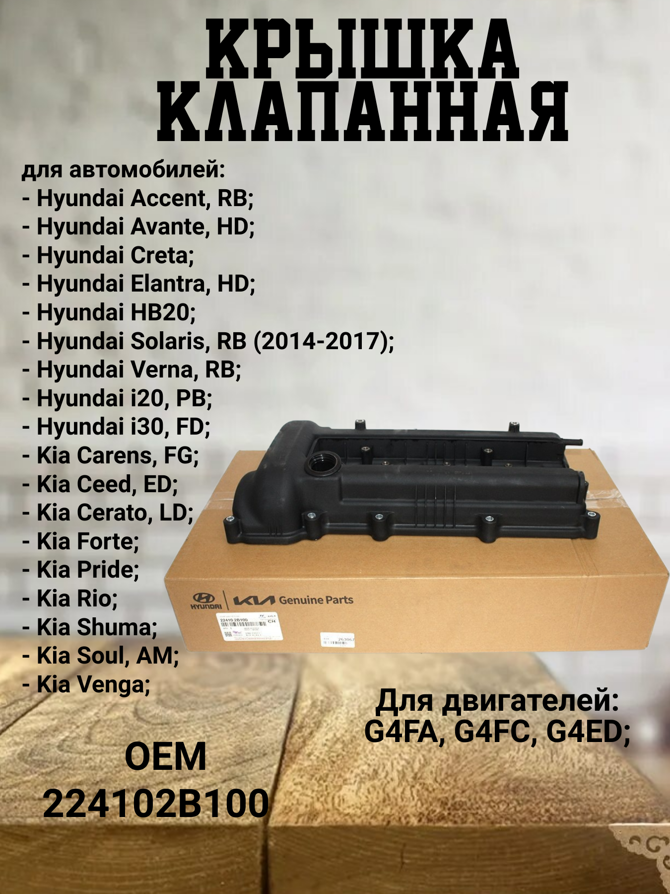 Крышка клапанная Hyundai/Kia (224102B100) подходит на следующие марки автомобилей: