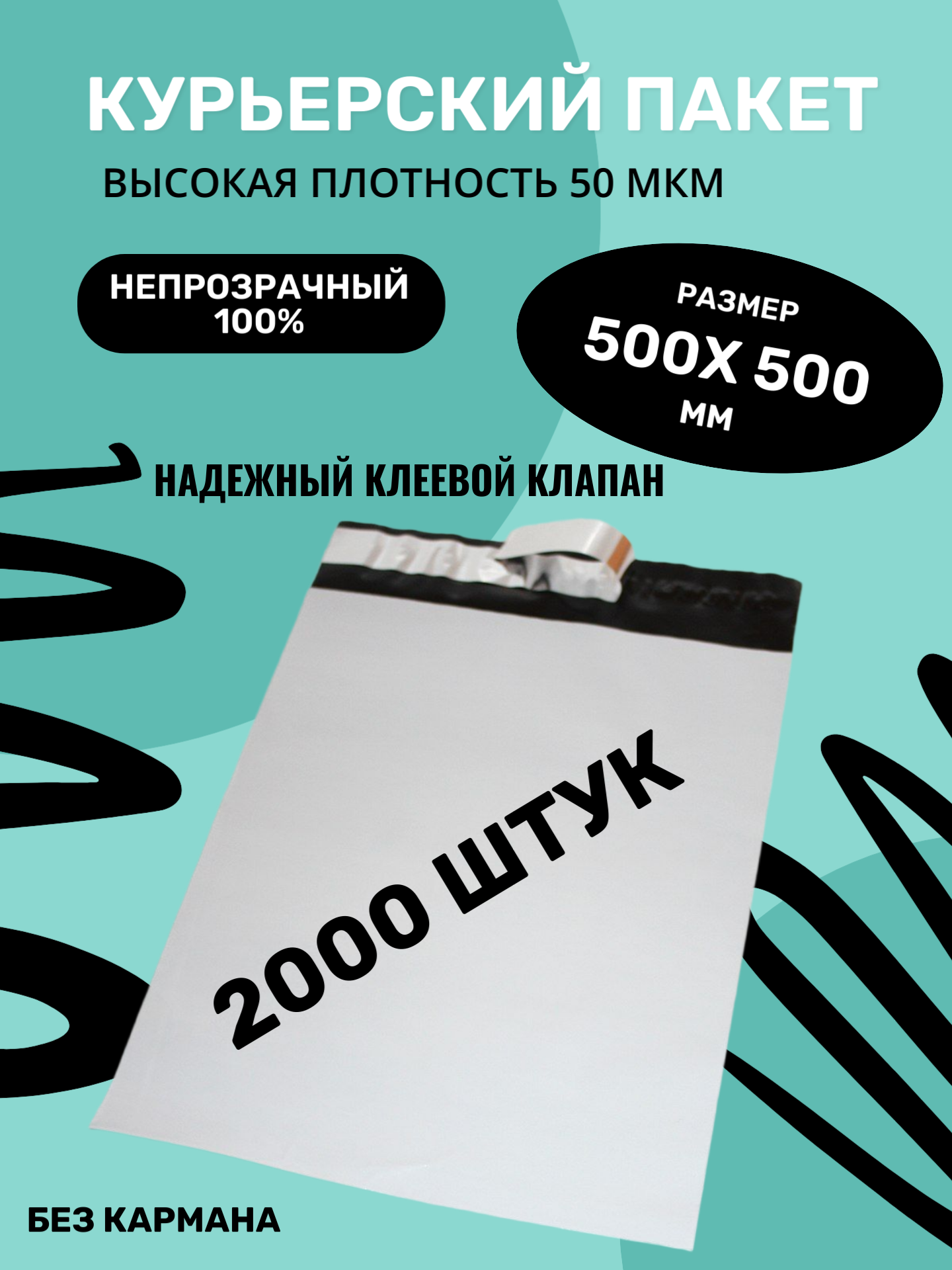 Курьерский упаковочный сейф пакет 500х500 мм, + 40мм клеевой клапан, 50 мкм, 2000 шт
